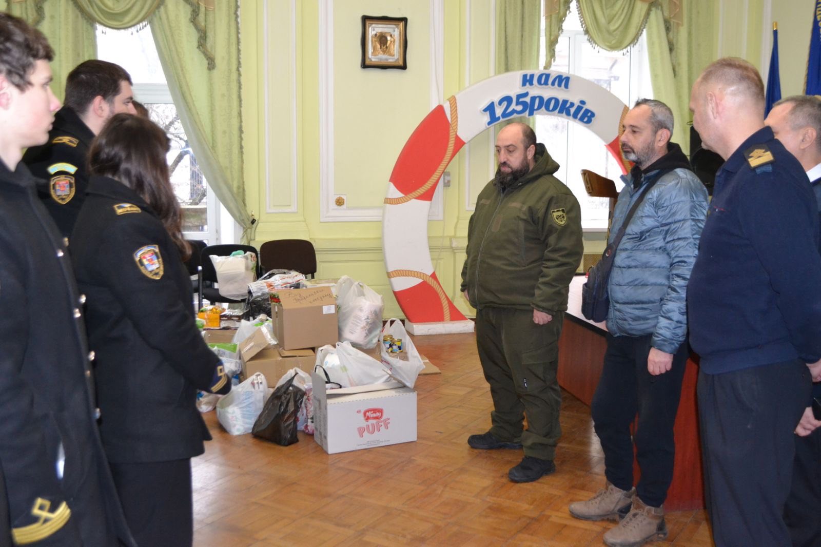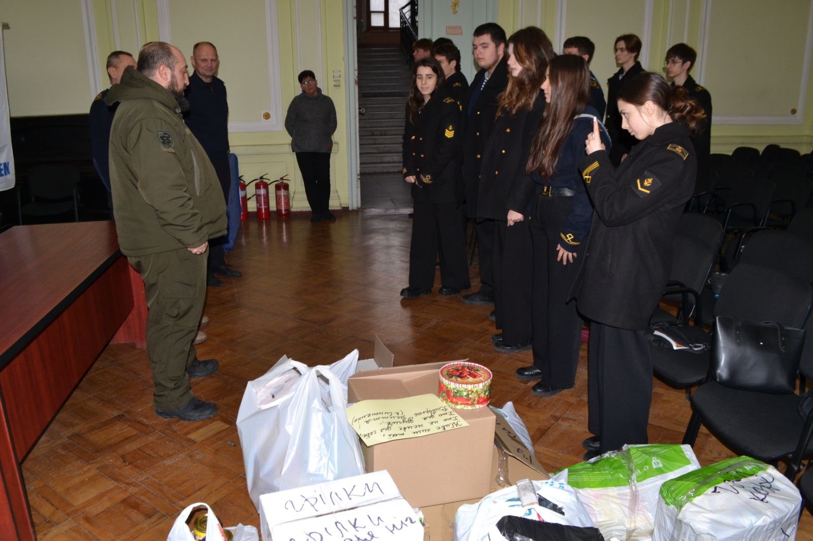 У непростий для України час підтримка наших захисників залишається справою честі та відповідальності кожного громадянина. Саме тому майбутні моряки проявили громадянську зрілість і зібрали необхідні речі для захисників України. Ця ініціатива — приклад єдності фронту й тилу, де кожен тримає свій курс на Перемогу. Зібрані речі були передані безпосередньо представнику 3 батальйону 39-ї ОБрБО Анатолію Кучінському.