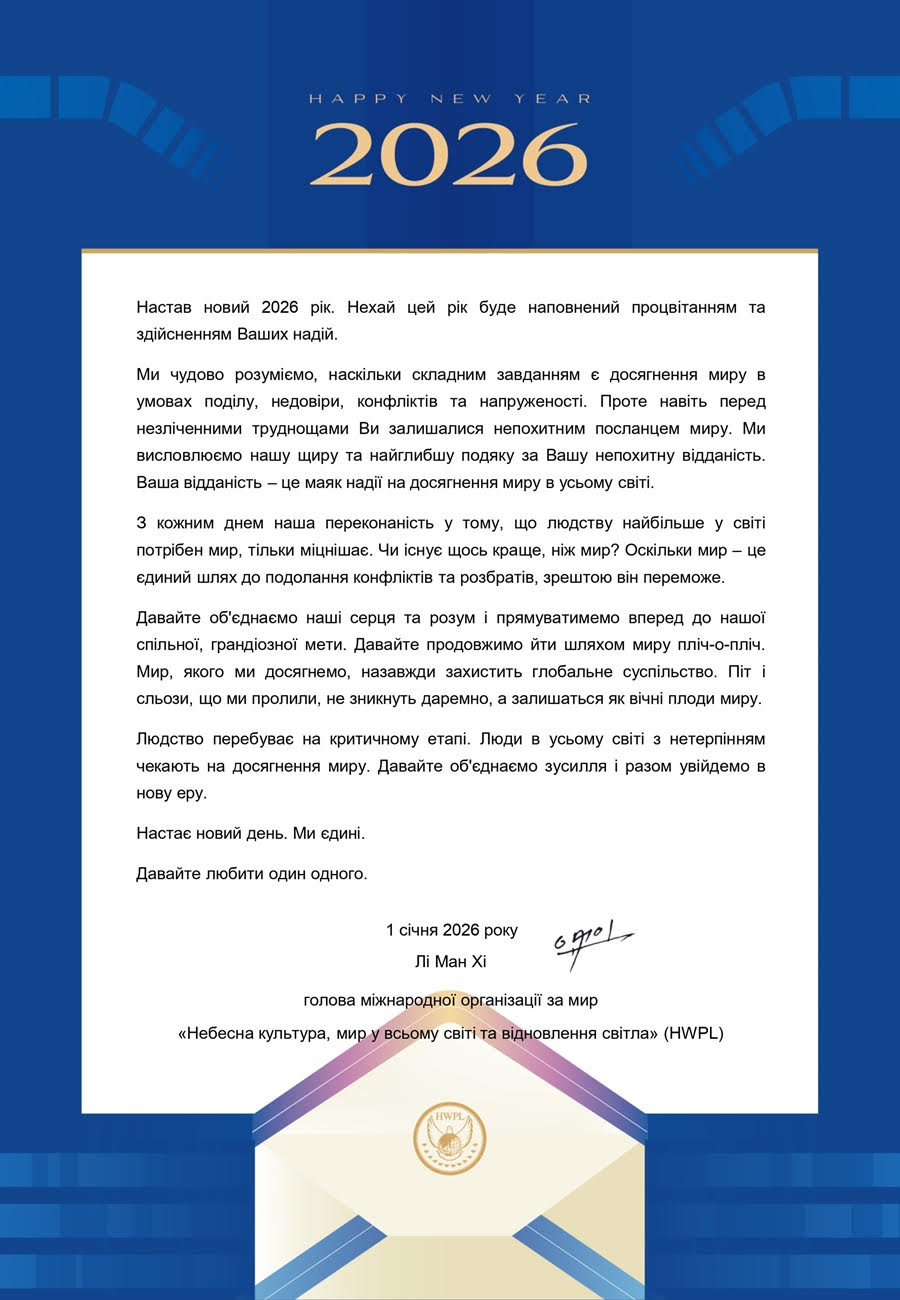 Надзвичайно приємною подією було отримання вітання з Новим 2026 роком від уже наших партнерів - Міжнародної організація за мир HWPL, зареєстрованої при Департаменті глобальних комунікацій та ЕКОСОР ООН.